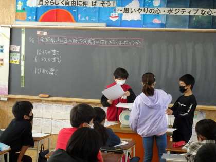 算数科では、全部を数えずに紙を300枚用意するにはどうしたらよいのか考えました。子供たちは、比例の関係になっているものの、誤差が生じる場合もあることを理解しました。