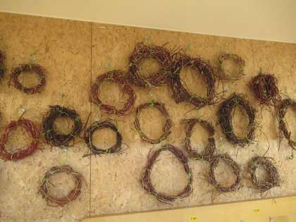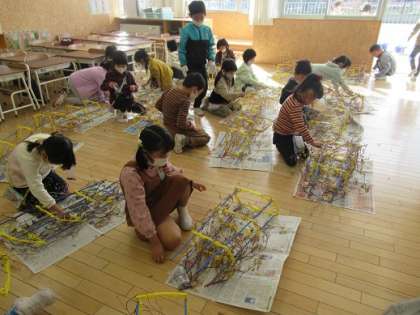 大切に育ててきたあさがおとずっと一緒にいられるようにという願いを込めて、アサガオリースを作り始めました。今日は、支柱からつるをはなし、つるの形を整えながら丸めました。来週からは、飾りをつけていきます。