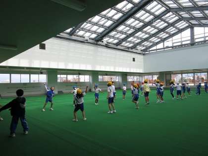 ジャンプ、手拍子、手回し等、様々な動きを行いながら、リズムに合わせて楽しくダンスをしています。