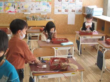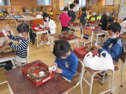 先週作ったあさがおのリースに、リボンや秋の植物の実を付けて飾りを作りました。世界に一つだけの自分だけのリースができて、満足な様子でした。
