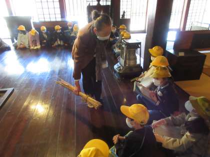 いろりをかこんで昔のくらしについて話を聞きました。多くの手間をかけて建てられた家に驚いていた子供たちでした。