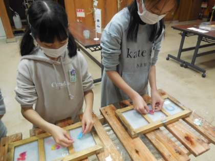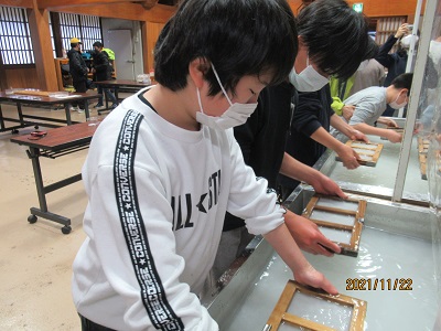 和紙の里では、実際に和紙すき体験を行いました。和紙の原料や作り方についてもビデオを見て学ぶことができました。できあがった和紙のはがきに大喜びの子供達です。