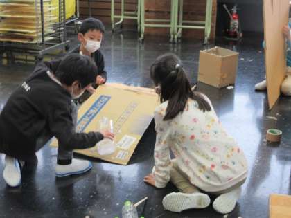生活科の学習では、動くおもちゃを工夫して作っています。同じおもちゃを作っている友達と自然にグループになった子供たちは、さらにパワーアップした遊び方を考えていました。