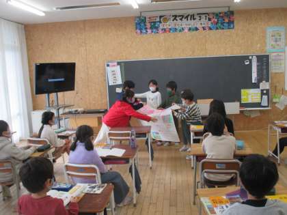 先週の読み聞かせ会のお礼のメッセージを書きました。そして、代表の子供たちが自分の言葉で、お礼の気持ちを伝えて渡しました。3年生からは、拍手や「ありがとう」の言葉が贈られ、とても嬉しそうな様子でした。