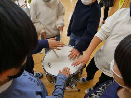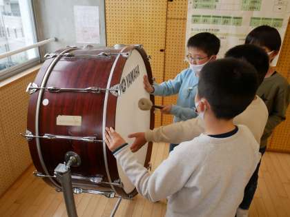 子供たちは、自作楽器「フルエール」を使って音について調べてみたい問題を作りました。それぞれの考えた方法でその問題を確かめました。大太鼓や小太鼓などの打楽器を使って、振動が伝わってくることや音の鳴るものは振動していることを確かめました。