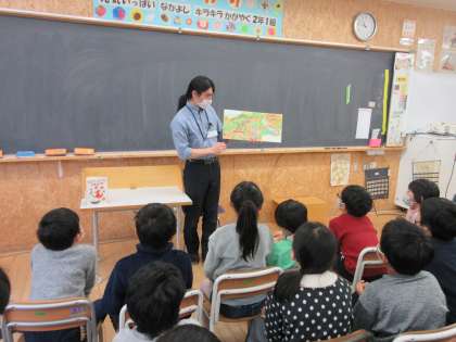今日は、1組と2組に図書館の方と読み聞かせボランティアの方が来てくださいました。子供たちは「屋根がチーズでできた家」の語りを聞いて、思い思いにイメージを広げて楽しんでいました。