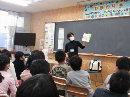 今日は、3・4組に市立図書館の方が来て本の紹介をしてくださいました。