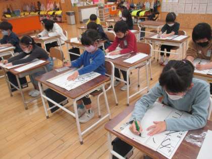 初めての書き初め練習をしました。子供たちは、お手本をよく見て、丁寧に書いていました。