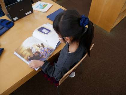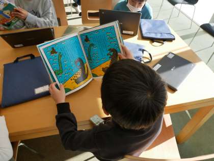 図画工作科の学習では新しく版画の学習が始まりました。今日はテーマにする本を決め、そのお話に出てくる生き物の好きなシーンを切り取って、何を版画にするか決めました。これから始まる初めての彫刻刀を使った版画に、子供たちはわくわくしている様子でした。