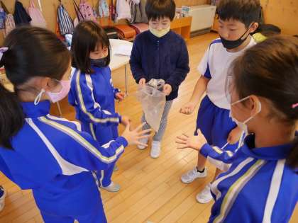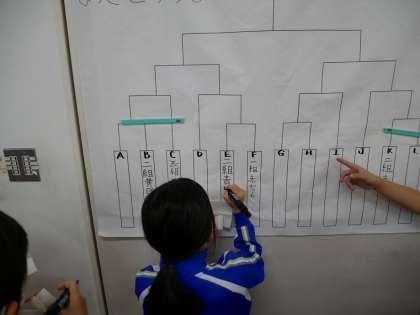 体育で取り組んできたアルティメットの学年トーナメント戦を開催します。学級代表が中心となって進行しました。対戦相手が決まり、燃えている子供たちです。