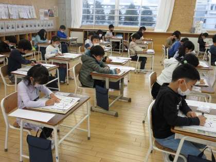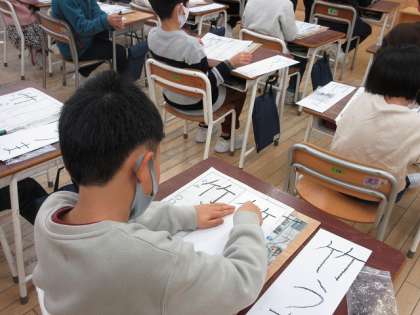 書初大会では、練習した成果を発揮しようと、文字の中心やとめ、はね、はらいに気を付けて「竹うま」という字を清書しました。