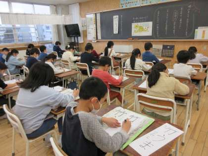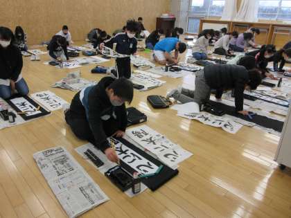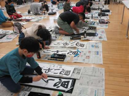3学期始業式の後は校内書初大会でした。「冬休み中にたくさん練習したよ」と張り切って大会に臨んだ子供たちは、真剣な表情で一筆一筆に思いを込めていました。