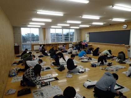 書初大会の様子です。子供たちは、練習の成果を出し切ろうと集中して取り組みました。
