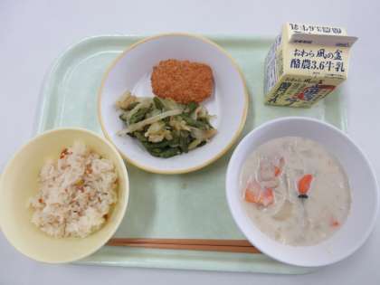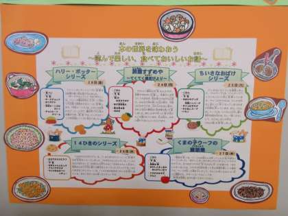 1/25(火)〜1月27日(木)は給食週間です。期間中は特別メニューになっています。テーマは「本の世界を味わおう〜読んで楽しい、食べておいしいお話〜」で、いろいろな物語に登場する料理や食材を取り入れた献立になっています。今日は「14ひきのシリーズ」にまつわるメニューでした。給食委員が、校内放送でくわしく紹介をしてくれます。みんな毎日楽しみにしています。