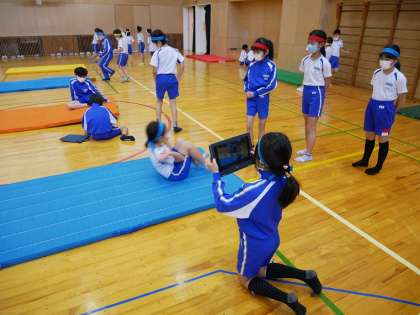 マット運動に取り組んでいます。自分の習得したい技を決め、その技の練習を工夫しながら行っています。こつを調べたり、手本となる動画を見たり、自分のフォームを撮ってもらったりして、工夫しながら練習を進めています。