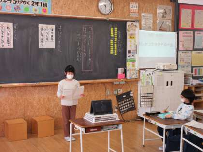 国語科の学習で、2年生でがんばったことを発表しました。みんなの前で緊張しながらも、自分の思いを一生懸命に伝えようとしている姿がとても素敵でした。「頑張れ。」「上手だったよ。」と声をかけ合う様子も見られ、子供たちの成長が感じられる時間となりました。