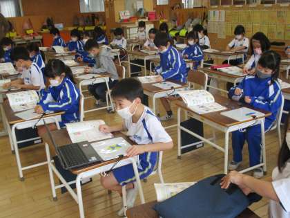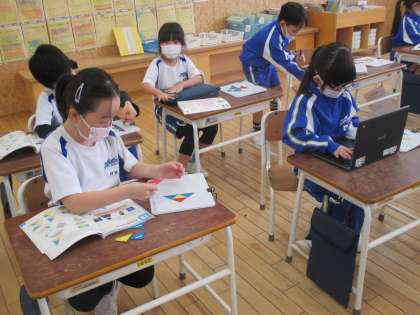 さんかくの色板を使って、いろいろな形を作りました。さんかくの色板を2まい使うと大きなさんかくや、ましかくなどができることに気付きました。