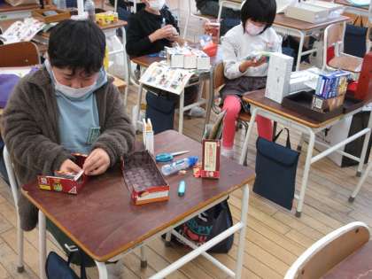 小石やペットボトルのふた等を友達として、その友達が喜ぶ家をテーマに小さな家を作っています。空き箱やカップなど、集めた材料の形を見たり、イメージを膨らませたりしながら、それぞれの「ともだちハウス」を楽しく作っています。