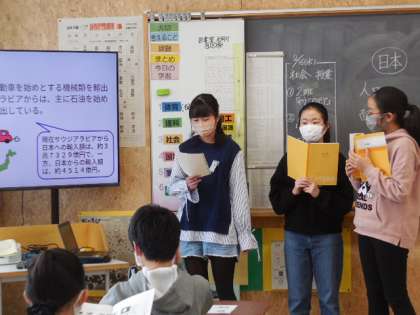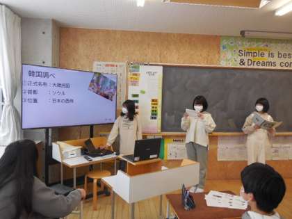 社会科の学習では、アメリカや中国、韓国等、日本とつながりが深い国々について一人一人が調べ学習を行いました。最後はグループでスライドを作成し、調べたことのまとめを発表しました。