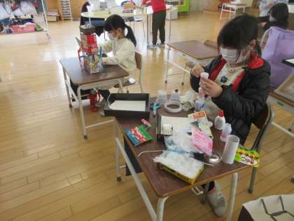 図画工作科の学習では、空き箱やプリンカップなどを使って、お家をつくっています。石や貝殻に顔を描き、友達に見立てながら、友達が喜ぶお家になるよう、工夫しています。