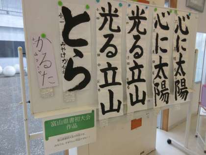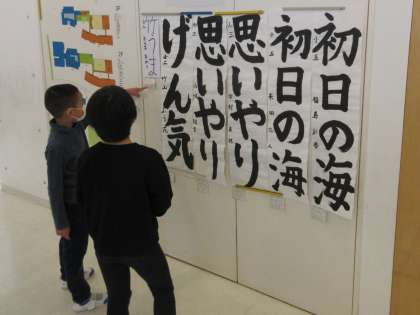 2月11日に行われた富山県書初大会の学校代表者の作品が児童玄関に掲示されていました。力強く表現された友達の作品を見ながら、「すごいね」と感想を話し合ったり、「こんな風に書けるようになりたいな」と刺激を受けたりしていた子供たちです。