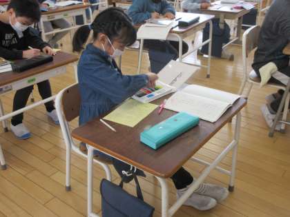 国語科の学習で、1年間一緒に過ごした友達のすてきだなと思うところを手紙に書きました。たくさんの思い出を振り返りながら、温かい表情で書いていました。