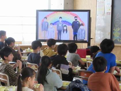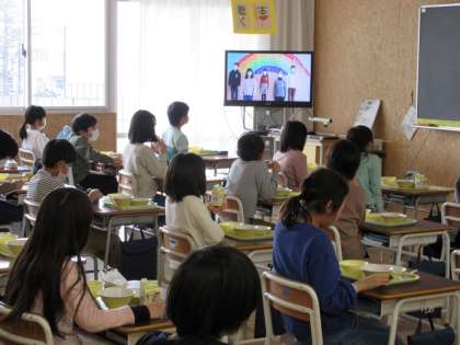 1年生から5年生が、18日(金)に行われた卒業式の様子と、卒業生の門出の言葉を校内放送で見ました。お世話になったお兄さん、お姉さんの晴れ姿を、みんなは熱い眼差しで見つめていました。