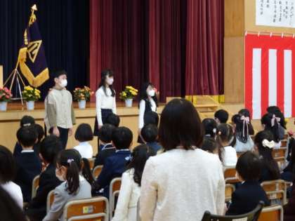 歓迎の言葉を、6年生が在校生の代表として伝えました。みんなで入学を心待ちにしていたことや、芝園小学校のよいところを心を込めて伝えました。「困ったことがあったら何でもぼくたち6年生に聞いてね」という言葉に力がこもっていました。