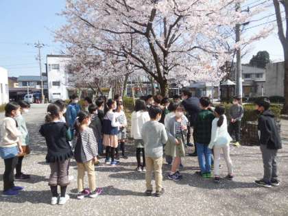 今日はよい天気で、しかも桜がきれいに咲いていました。お花見も兼ねて、校舎のそばにある桜の木の下で記念写真を撮りました。