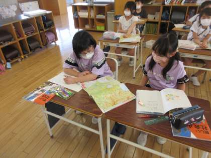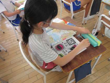 社会科の学習では地図帳を使って、各地の名産品を調べました。それぞれの地域の名産品を知ることで、各地にどんな名産品があるのか、気になっている様子でした。