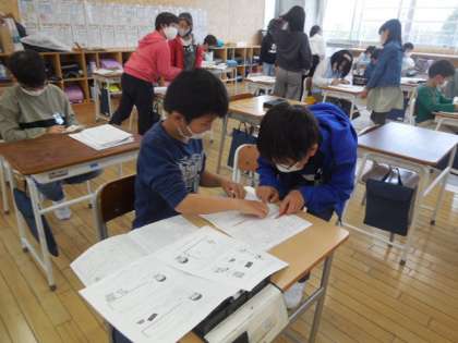 先日行った学力調査の見直しを行いました。間違えた問題を友だち同士で教え合ったり、理科の問題では昆虫の体のつくりを友だちと一緒にやってみて体感したりしていました。