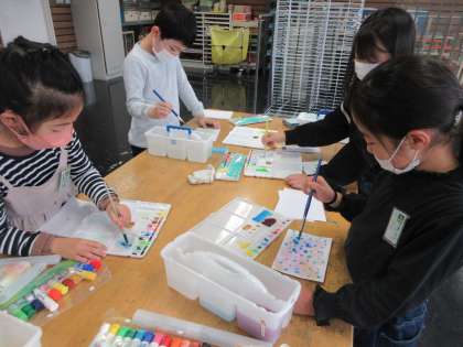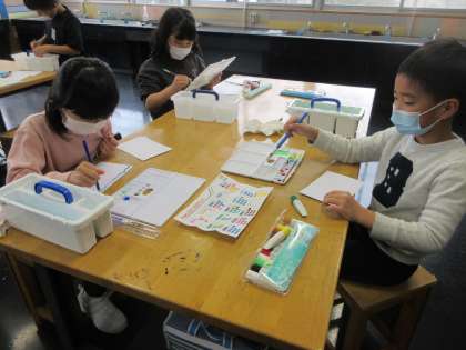 図画工作科の学習では、絵の具と水の混ぜ具合を試しながら、自分が「いい感じ」と思うふでの動きで、模様を描きました。「わあ〜!すてき。」「いい感じだね。」と、嬉しそうでした。