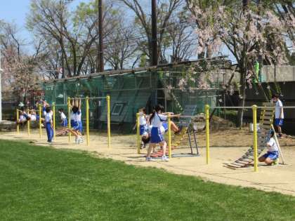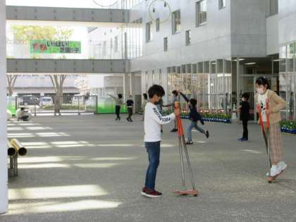 学習にも運動にも意欲的に取り組んでいる子供たち。休み時間(かがやきタイム)も元気いっぱいに活動しています。天気のよい日はグラウンドでのびのびと、雨の日もパサージュやプール室などで友達と楽しく過ごしています。1年生教室では、早く学校に慣れるようにと6年生が毎日遊びに来てくれています。一緒に仲良く遊ぶ姿がとてもほほえましいです。