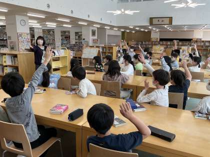 図書オリエンテーションでは、図書室の利用の仕方について復習し、本の分類について学習しました。クイズを通して、楽しく学習することができました。