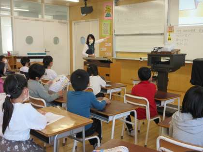飯田先生と一緒に、3年生になって初めて音楽の学習を行いました。拍にのって言葉をつなげたり、声を合わせて歌ったりと、みんなで音楽を楽しみました。