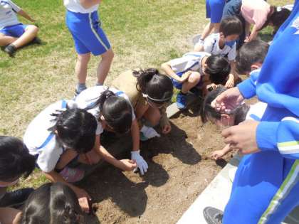 今日は天気も良く、花壇にへちまの種を植えました。これから、へちまの成長をじっくりと観察していく予定です。
