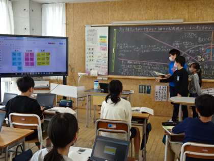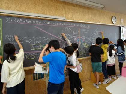 各グループの考えを、黒板にまとめます。そして、それぞれのグループの考えを聞き合い、つなげることで、物語を読み深めました。一人一人が活躍し、みんなで授業をつくることを目指しています。