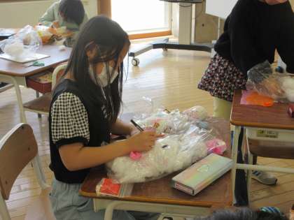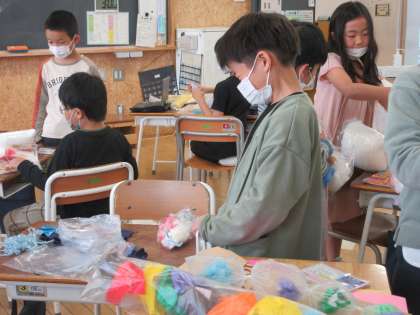 図画工作科では、透明な袋にお花紙や毛糸を入れて、透けたかんじを楽しみながら素敵な友達を作り始めました。材料の組み合わせでイメージが変わるところも、面白いですね。