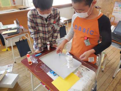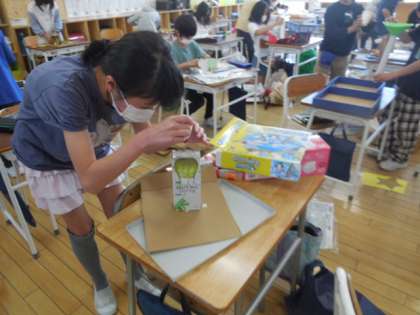 家で集めた箱や段ボール等を使って、ビー玉を転がして遊ぶ迷路のようなものを作り始めました。「すべり台をつけたいな」「トンネルを作って、その中にビー玉を転がそう」などと、思い思いにイメージを膨らませ、作品づくりに取り組んでいます。