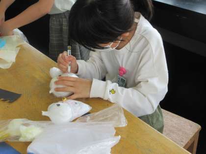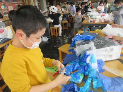 図画工作科の学習で、透明な袋にお花紙や毛糸など様々な材料を入れ、できた色合いや形を楽しみながら、すてきな友達をつくりました。