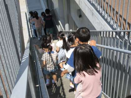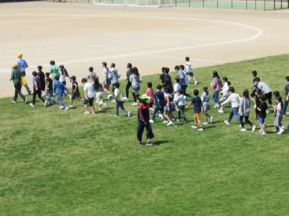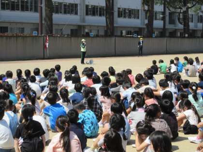 今月の避難訓練は、全校がグラウンドに避難する想定で行われました。非常階段を使って避難するのが初めての1年生は、緊張した面持ちで訓練に臨んでいました。「お(押さない)」「は(走らない)」「し(しゃべらない)」「も(もどらない)」の合い言葉が守れたか、全校で振り返り、訓練の大切さを確かめました。