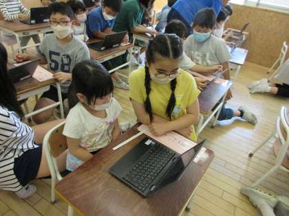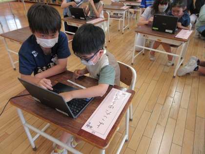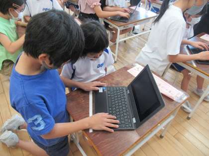 アカウントやパスワードの登録等を6年生さんに教えてもらいながら初めてクロームブックを使いました。6年生さんに優しく教えてもらい、とても嬉しそうな1年生の様子が見られました。