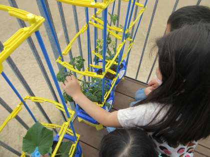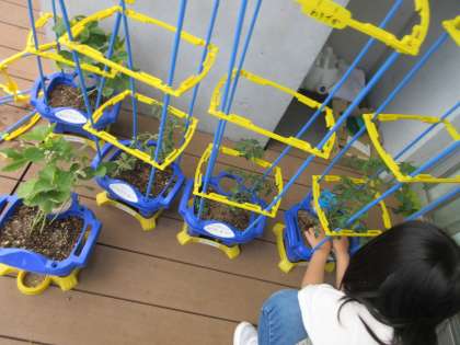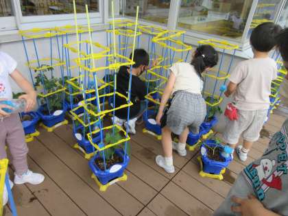 野菜の苗植えの後、「水はいつやればいいのだろう?」「ひりょうにはどんなものが入っているのかな?」など、知りたいことがたくさんでてきました。