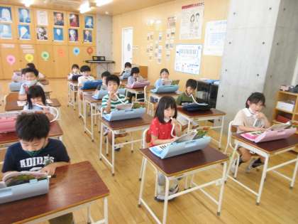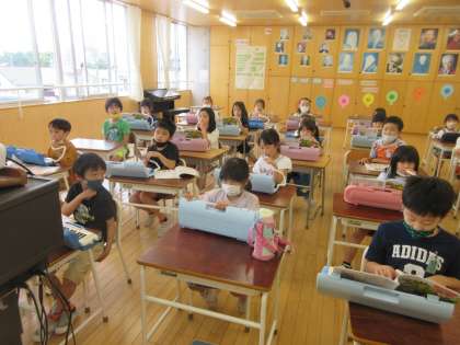 距離をとりながら、鍵盤ハーモニカを弾いています。階名をしっかり覚え、指番号も確認しながら楽しんで演奏できました。