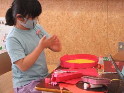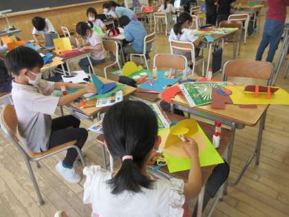 図画工作科では、画用紙をわりピンで留め、回る仕組みをつくっています。しかけを生かしてどんなものをつくろうか、楽しそうに試行錯誤していました。