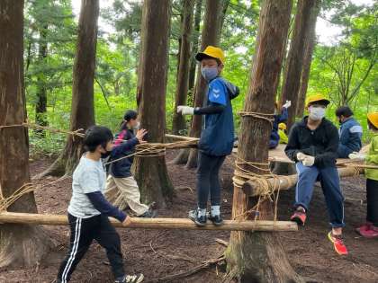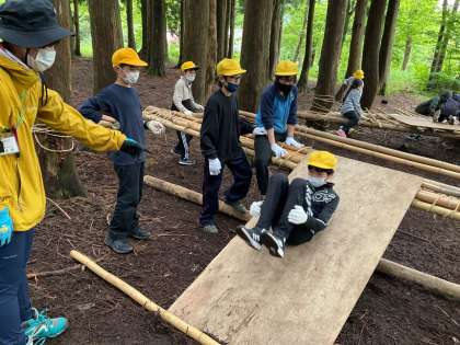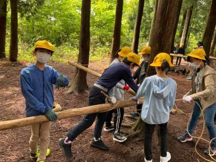 みんなで協力して木を運んだり、縄を結んだり、協力してオリジナルの森小屋を作りました。片付けも自分の班の分だけではなく、他のチームやクラスの分も手伝うなど、心を一つにして頑張ることができました。