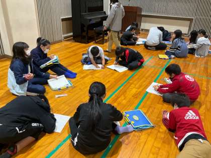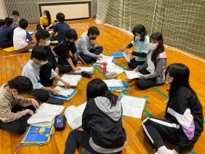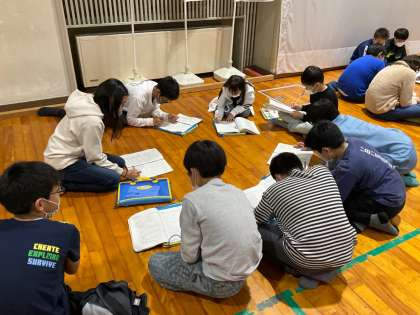 キャンプファイヤーを終えて、ホールで振り返りをしています。1日目を終えて、今感じていること、成長できたと思うこと、意識できたこと、明日に生かしたいことなど、宿泊学習での学びをしっかりと見つめています。