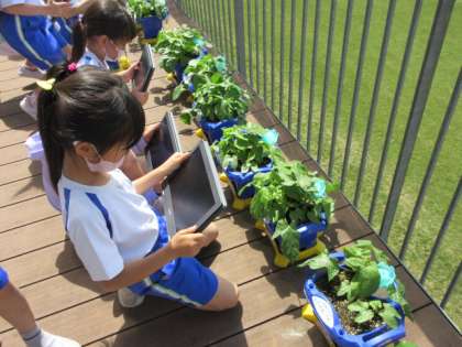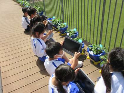 1年生は、一人一人が自分のあさがおを育てています。今日は、クロームブックを使って、あさがおの写真を撮りました。拡大してみると毛が生えていることに気がついたり、友達に写真を見せながら、葉っぱが大きくなったことを嬉しそうに話したりしていました。