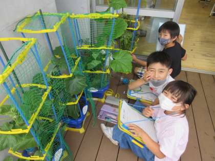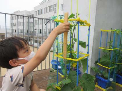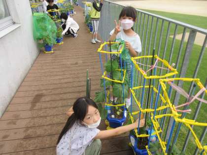 2年生 野菜を育てよう 公開日 2022/06/15 更新日 2022/06/15 2年生のページ 「実がなったよ!」「30cmものさしが3本分ぐらい、伸びたよ!」など、毎日喜びの声がベランダから聞こえてきます。「キュウリは、つるが伸びていくのであみにからませるよ。」「虫除けには牛乳をかけるといいんだよ。」「アルミホイルなどの光があれば虫はこないらしい。」などなど、調べたことや聞いたことをなかよく共有しています。 笑顔で収穫できるといいですね。