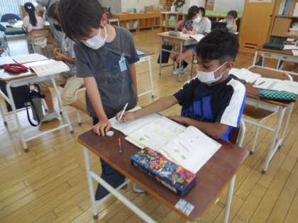 単元のまとめは自分で学習内容を選択し、自分のペースで学びを進めています。先生と一緒にもう一度教科書の問題を解き直す子供、発展問題にチャレンジする子供など、様々です。